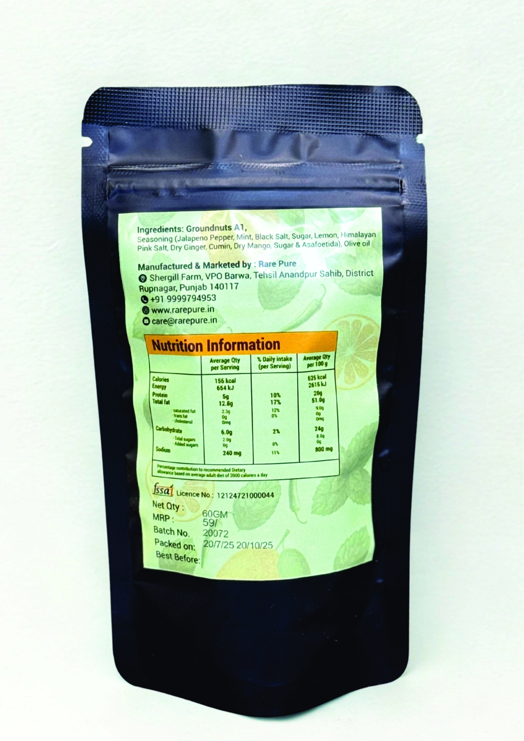 Each peanut is perfectly roasted. Then, we coat it with a vibrant blend of tangy lemon (nimbu), fiery green chili (mirch), and cool, aromatic mint (pudina). We use a cold-pressed seasoning and a touch of premium olive oil for rich flavor and a satisfying crunch.